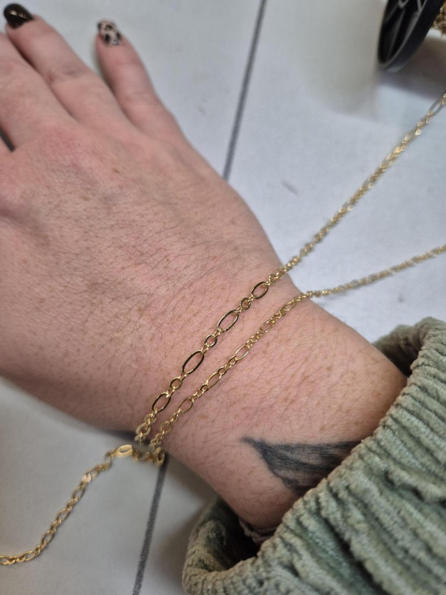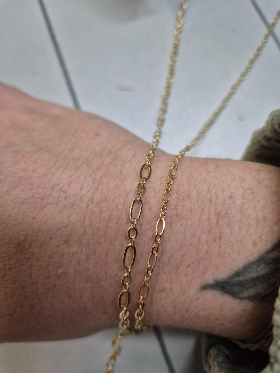 ¡Enamórate de estacadenachapada en oro de 3 micras! Su malla se compone de tres pequeños eslabones redondos que se alternan entre cada gran eslabón ovalado.