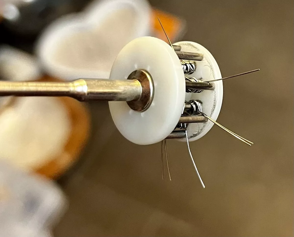 Para dar forma a la pieza, colóquela contra el cepillo giratorio. La acción de las cerdas cepillará suavemente la joya, creando arañazos pequeños, finos y uniformes en la superficie metálica. El mateado será uniforme y dará un acabado satinado.