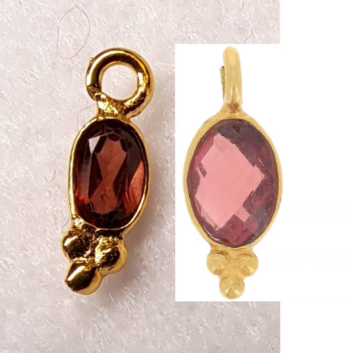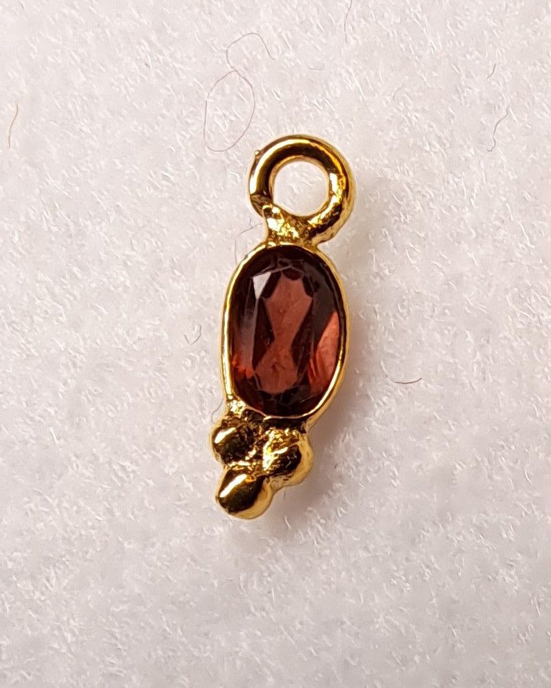Este colgante de latón de forma ovalada está dorado con oro fino. Está engastado con una gema granate facetada.