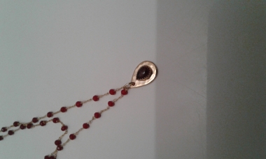 Este elemento de bisutería tiene forma de gota, con la superficie martillada. Lleva engastado un cabujón en forma de gota de color granate con bordes dentados, lo que le confiere un estilo antiguo. El Dije se sujeta con una anilla cerrada.