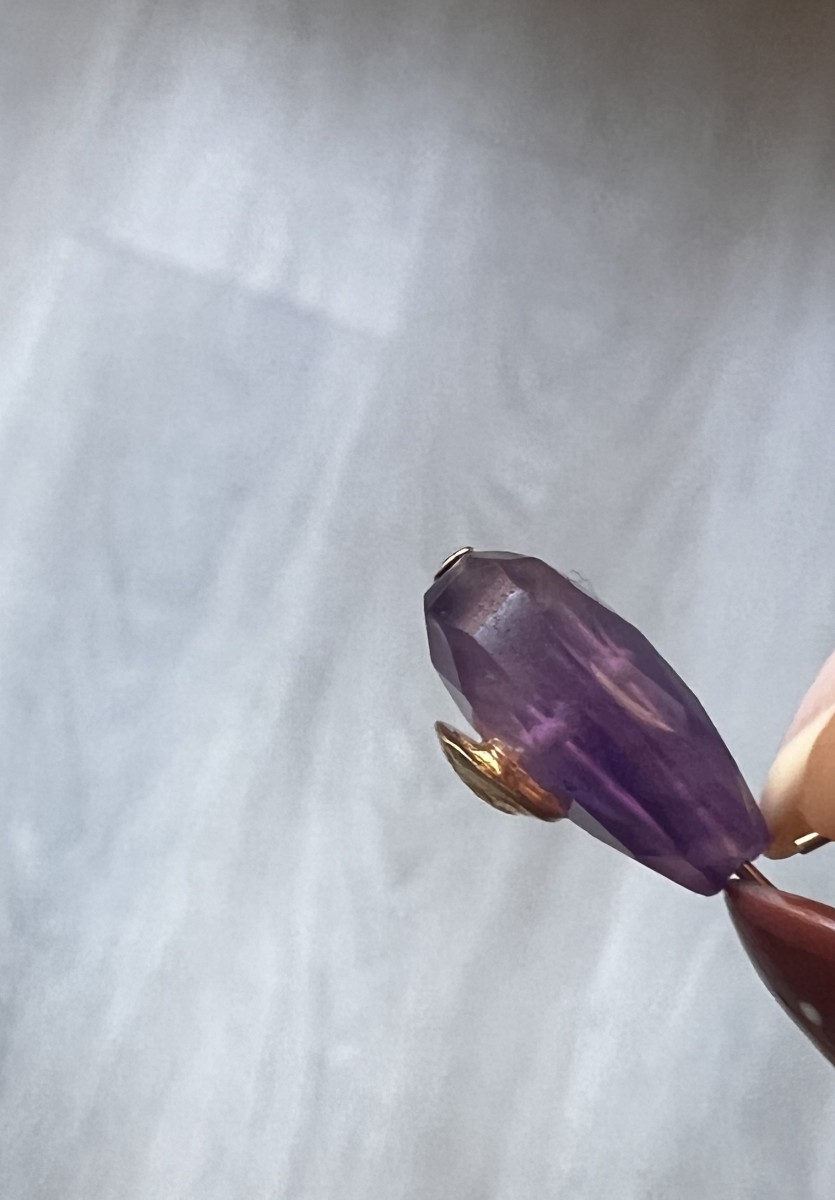 Añada elegancia y refinamiento a sus creaciones con esta cuenta gota de amatista, adornada con un motivo étnico dorado con oro fino.
