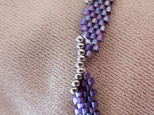 Las cuentas Delica "satén de seda" están fabricadas con fibra de vidrio para conseguir un efecto de "satén de seda", lo que las hace más frágiles que las cuentas Delica clásicas y un poco más irregulares. El borde de fibra de vidrio sobresale y puede cortar el hilo de tejer.