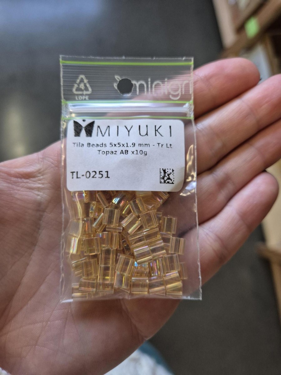 Por cáusa de su forma, su finura y la perforación que llevan (2 agujeros), las Tila Beads son más frágiles que los otros productos Miyuki.