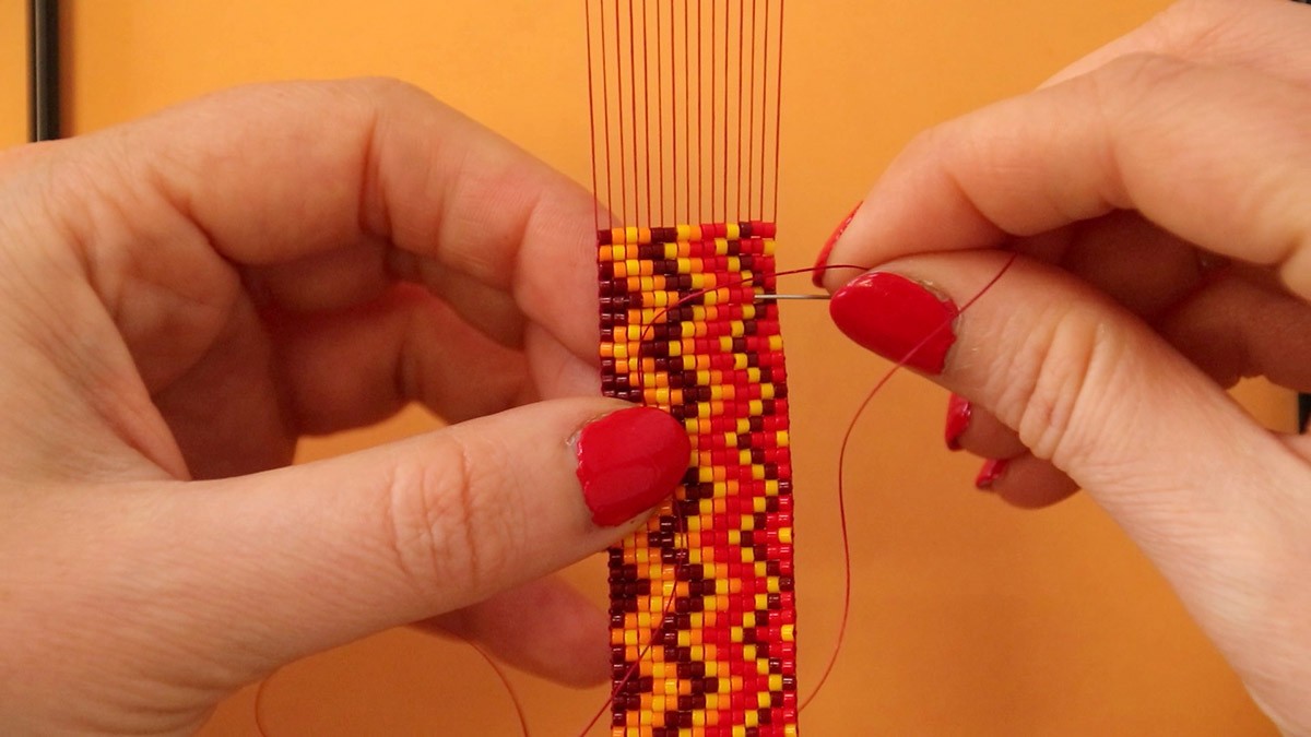 Corta un trozo de brazo de hilo y enhebra el hilo en la aguja. La fijación del hilo en la trama se realiza de la misma manera que la detención del hilo en la trama. Pasa la aguja por una de las filas de cuentas del tejido sin empezar por el borde. Utiliza el dedo para levantar el tejido, lo que separará las cuentas y te permitirá pasar con éxito la aguja dentro de una fila de cuentas. Saque la aguja unas cuentas antes del borde. Pase por una nueva fila de la misma manera. Sujete el extremo del hilo para que no se deslice cuando tire del hilo a través del tejido. Haga esto cuatro o cinco veces y luego regrese a la última fila de cuentas tejidas y continúe su tejido.