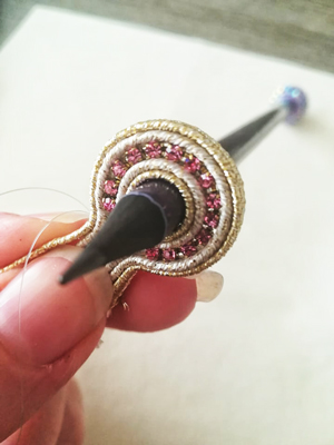 16) Coge dos trozos de soutache dorado y enróllalos alrededor de las dos gotas exteriores, une las dos "antenas" a la gota grande y dale la vuelta al soutache, formando dos bucles.