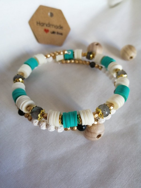 Decidimos mezclar dos elementos esenciales del verano para esta sencilla joyería de bricolaje. Heishi perlas y piedras preciosas o piedras naturales. En este paso a paso, encuentre dos modelos diferentes de varillas. Uno elegante y sofisticado, y el otro en colores vivos con un magnífico color turquesa.