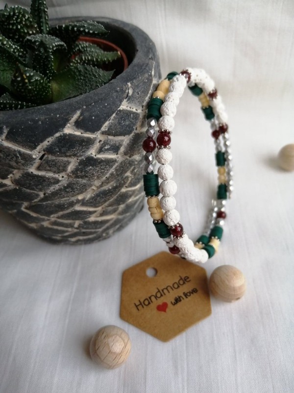 La ventaja de este brazalete DIY de dos vueltas es que no hay necesidad de un broche. Usamos cable de memoria. Es un alambre metálico formado de acuerdo con cierto diámetro de un círculo en la fábrica y que recupera esta forma incluso si se estira. Por lo tanto, puede ponerse las pulseras girándolas alrededor de su muñeca. Hay varios diámetros de cable de memoria, así que verifique el tamaño de su muñeca y elija el que más le convenga. Aquí usamos un brazalete de alambre de memoria de 60 mm de diámetro que corresponderá a una gran mayoría de muñecas de S a M. Si su muñeca mide más de 15.5 cm, es posible que tenga que tomar 65 o 70 mm.