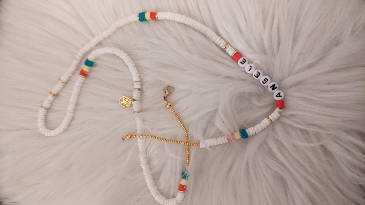 Pase una arandela de metal dorado, una perla de corazón, una arandela de las 3 letras sol ,, 4 heishi blancos, un disco, una docena de blancos, un disco, 10 heishi de colores y 10 blancos para terminar con las perlas grandes. Pase un jardín de rocas en el hilo y haga un nudo en la perla como en el otro lado, ensarte los otros jardines de rocas.