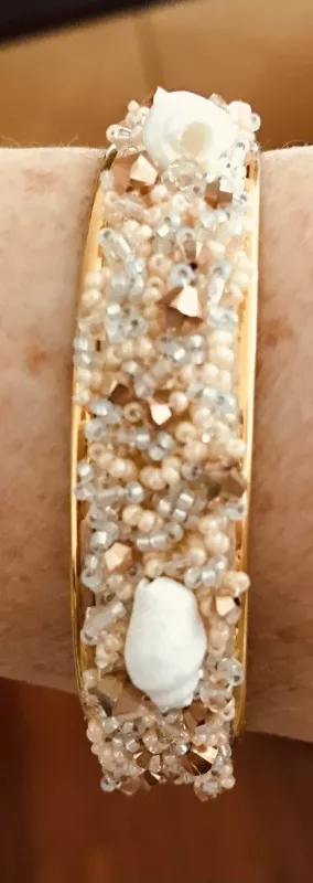 El principio es entonces alternar conjuntos de cuentas de semillas Miyuki o Toho con o sin biconos PureCrystal de 3 y 4 mm y cubrir la base de cuentas o lienzos de plástico para que no sean visibles. Para ello colócate en la última cuenta del tejido pero con el hilo saliendo por dentro del tejido, enhebra 7 cuentas de semillas 11/0 o 15/0, pasa en esta misma cuenta por el agujero opuesto y saca una cuenta más. A continuación, enhebrar 3 cuentas de semillas, 1 peonza y 3 cuentas de semillas y pasar por esta segunda cuenta para formar otro bucle y salir en la tercera cuenta y así sucesivamente.