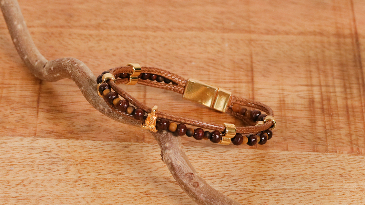 Descubre sin más demora este tutorial de joyería para hacer un brazalete de hombre de varias filas. Fino y en tonos marrones y dorados, también le irá bien a las mujeres y ¿por qué no hacer pulseras de pareja a juego? Este brazalete tiene un fuerte cierre magnético, cuentas de madera y cuentas de piedra de ojo de tigre escarchadas. En el pasado se creía que el ojo de tigre tenía un poder protector. Lo usaban algunos guerreros del Imperio Romano. ¡Esto te hará una anécdota para contar cuando ofrezcas este brazalete!