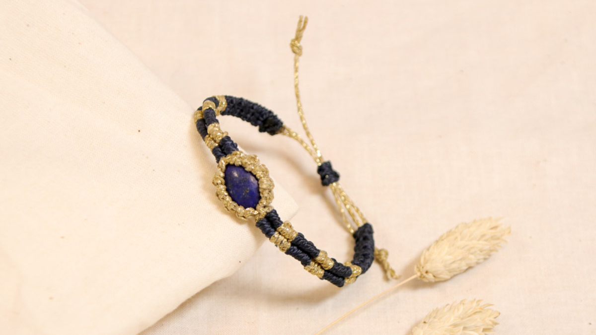 Este video tutorial muestra cómo colocar un cabujón de piedras preciosas con alambre de macramé. Puedes adaptar esta técnica a otras formas de cabujones. Por ejemplo, también funciona con cabujones cuadrados, redondos o triangulares de varios tamaños. El cabujón de Lapislázuli usado en este bricolaje mide 8x13 mm. Para usar un cabujón más pequeño o más grande, aumenta o disminuye la longitud del hilo y el número de nudos. Si disminuyes el tamaño del cabujón, usa hilo de 0,5 mm en su lugar.