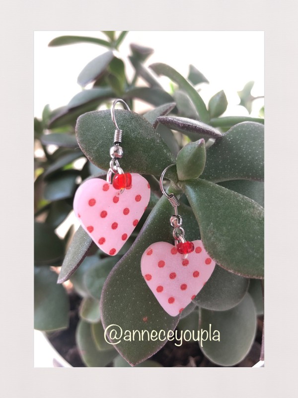 Espere a que sus piezas se enfríen y endurezcan antes de taladrarlas con un mandril manual con un agujero en el centro superior. Tome un abrasivo suave con un grano de mil por ejemplo para lijar los bordes afilados, así como la parte inferior de sus corazones, no lijar el patrón, ya que la pintura se irá inmediatamente. Pasa el hilo de tus minicreoles por el agujero de tus bucles.