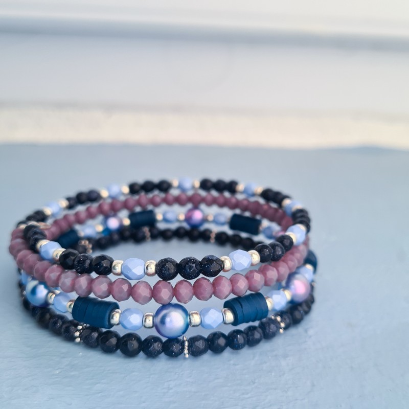 Los abalorios utilizados en este modelo son abalorios Miyuki "Le Ciel" que tienen bonitos colores de amanecer o atardecer, abalorios de semillas, abalorios de arcilla polimérica heishi , facetas bohemias, rondeles dorados y abalorios Blue Sand Stones.