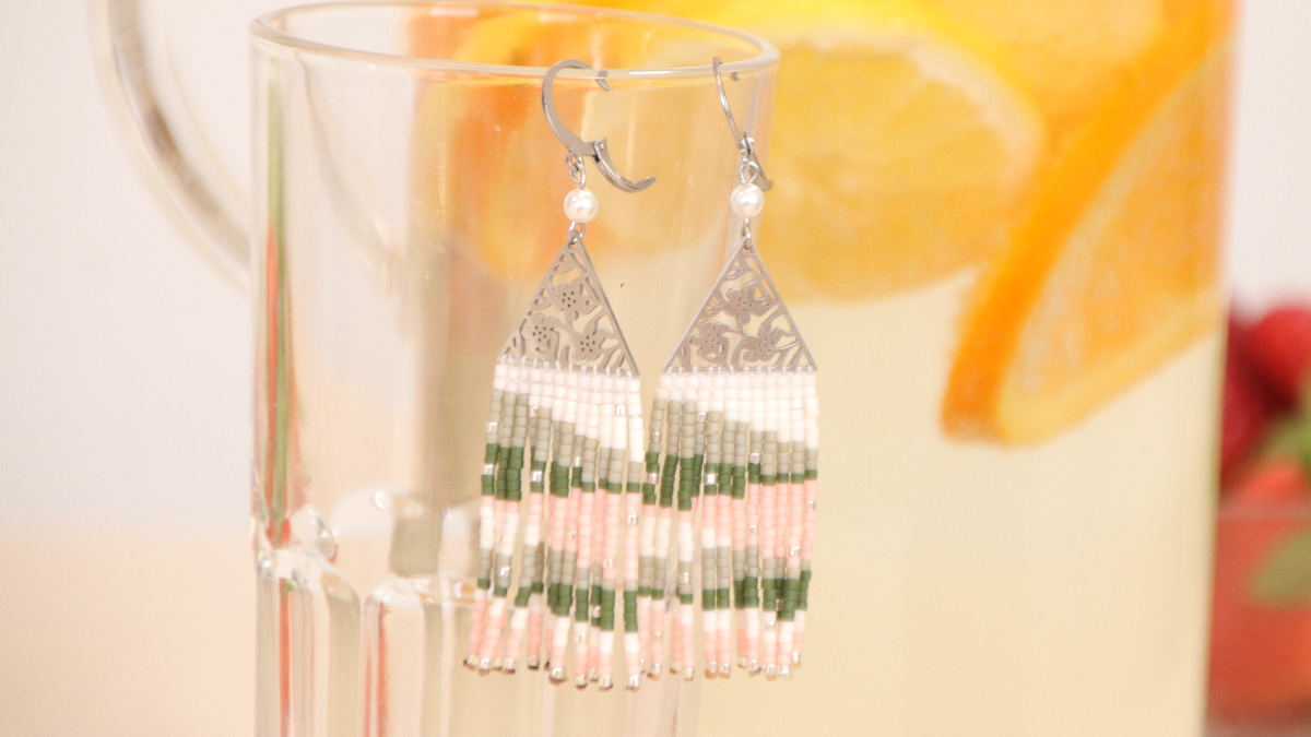 Cortar 6 trozos de hilo Linhasita de 16 cm de largo cada uno. Enhebrar 2 cuentas delicas 11/0 en cada hilo. Dobla los hilos por la mitad con una cuenta en cada lado. Puntea todas las cuentas una tras otra, asegurándote de que todos los hilos de Linhasita están en el mismo lado.