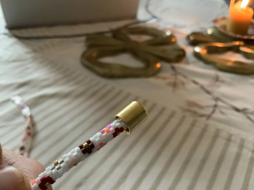 Te aconsejo encarecidamente que pongas un cordón de tope. Para ello, enhebra una cuenta (de un color que no esté presente en tu tejido, para no confundirlo) y plánchala. Lo retiraremos una vez que el tejido esté terminado.