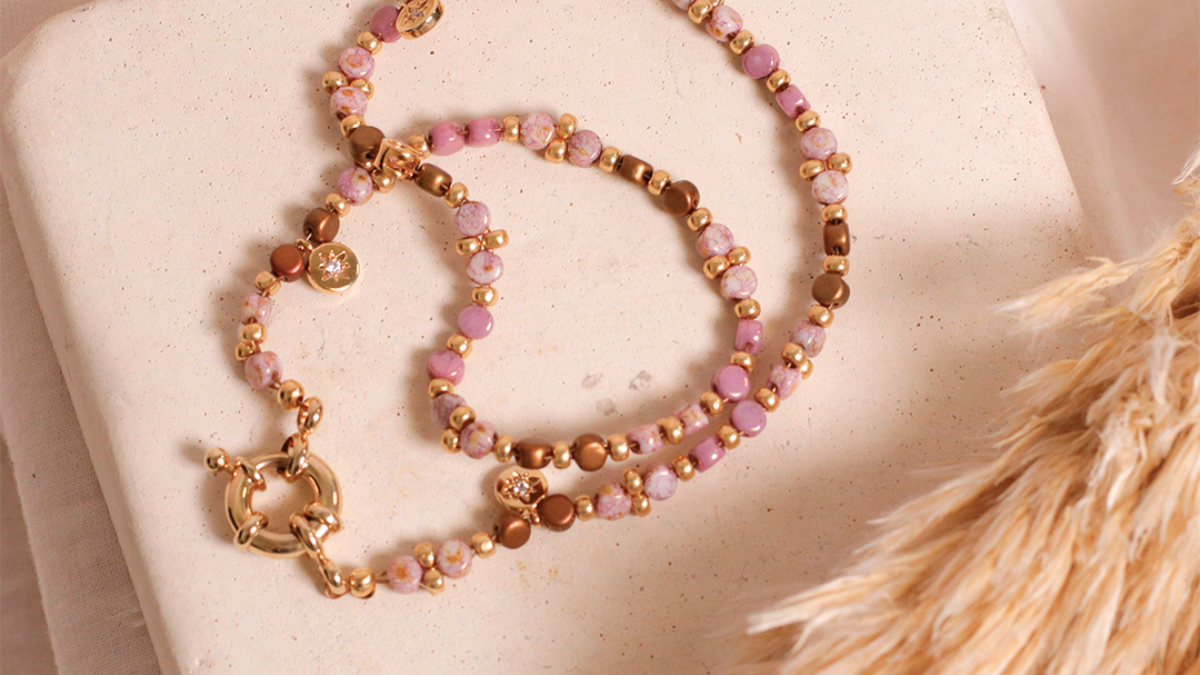 En cuanto al color, le ofrecemos una suave combinación de perlas rosas y doradas. Por supuesto, usted es libre de modificar los colores eligiendo entre todas las referencias de cuentas de vidrio Kalos de Puca, y todas las referencias de cuentas de semillas Miyuki 8/0 disponibles en nuestro sitio.
