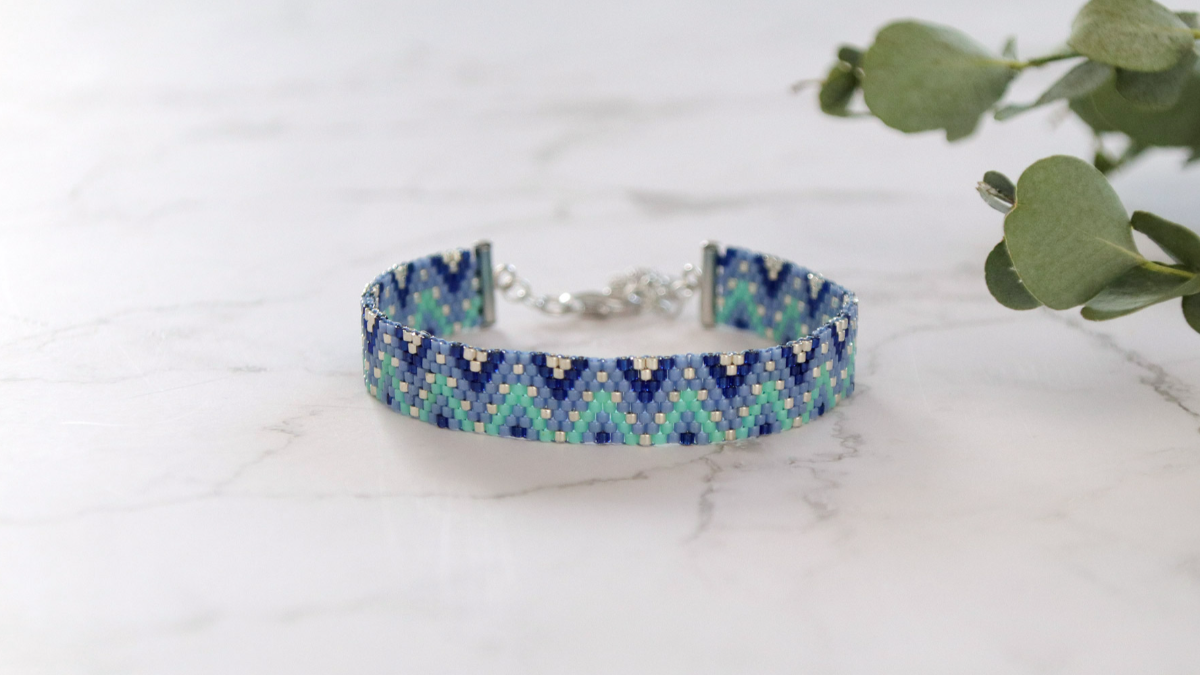 Corte 1,5 m de hilo de tejer y enrósquelo en una aguja del tamaño 12. Enhebre las siguientes cuentas: 2x DB-2191 azul oscuro, 3x DB-0266 azul, 1x DB-1831 plata, 2x DB-2125 verde agua. Corresponden a las 2 primeras filas del tejido. Tacha las cuentas en el diagrama a medida que las ensartas.