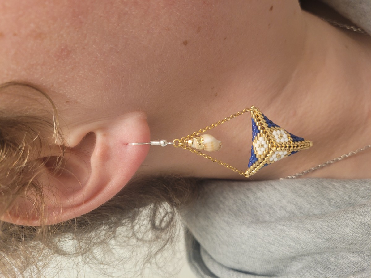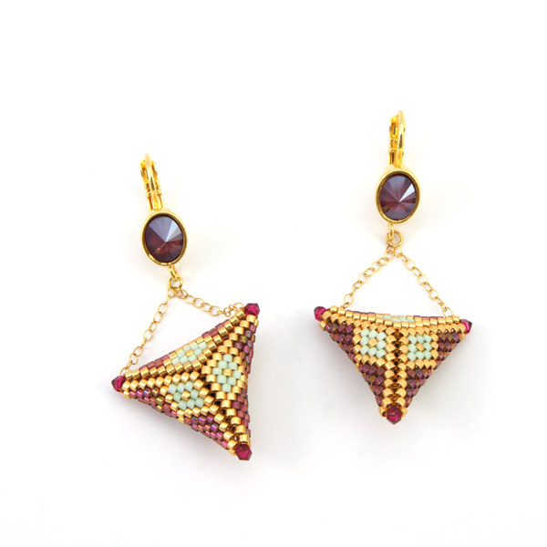 Con este vídeo ilustrado, aprenderá fácilmente a realizar un par de pendientes triangulares 3D tejidos en peyote con cuentas Miyuki Delicas y peonzas Swarovski.