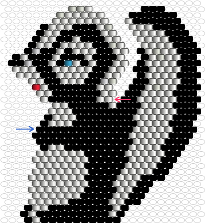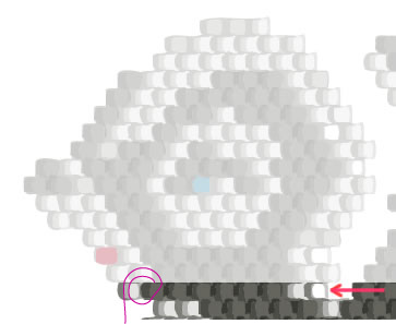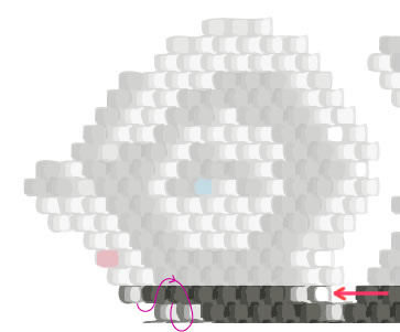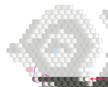 Para volver a colocar el hilo en la dirección correcta para continuar con la parte superior de la cabeza, pase a través de la cuenta anterior y, a continuación, a través de las cuentas de las filas inferiores, tal y como se muestra en los diagramas. Vuelva a subir por las cuentas de la fila y salga por la última cuenta blanca de la fila. A continuación, puede seguir tejiendo normalmente.