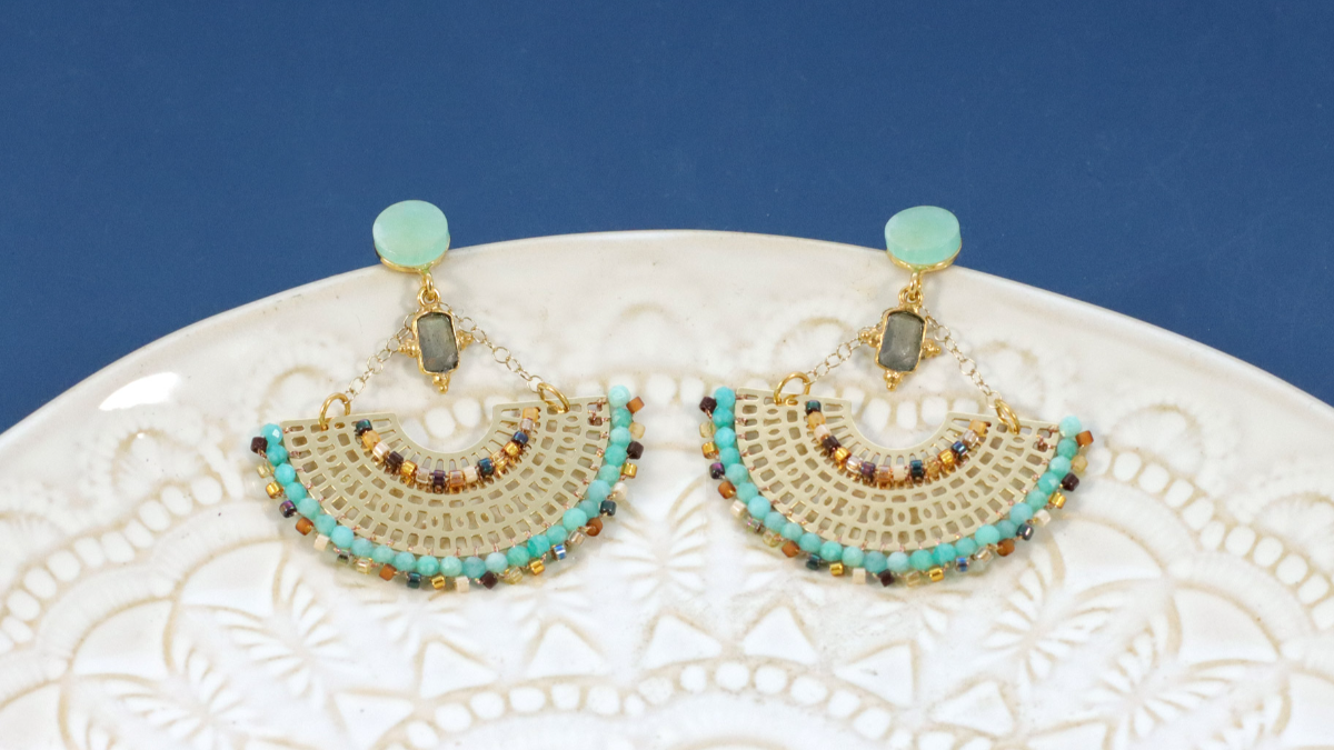 Estos pendientes de moda están hechos de amazonita, labradorita y una mezcla de pequeñas cuentas de vidrio Miyuki delicas. La mezcla de tonos arena y turquesa se adapta tanto al verano como al invierno. Sorprende a tus amigos haciendo tú misma estos pendientes. Puede personalizarlos con miles de combinaciones de colores diferentes. Tenemos una gran selección de cuentas Miyuki delicas 11/0 a su disposición, así como docenas de referencias de cuentas de piedras preciosas de 2 mm.