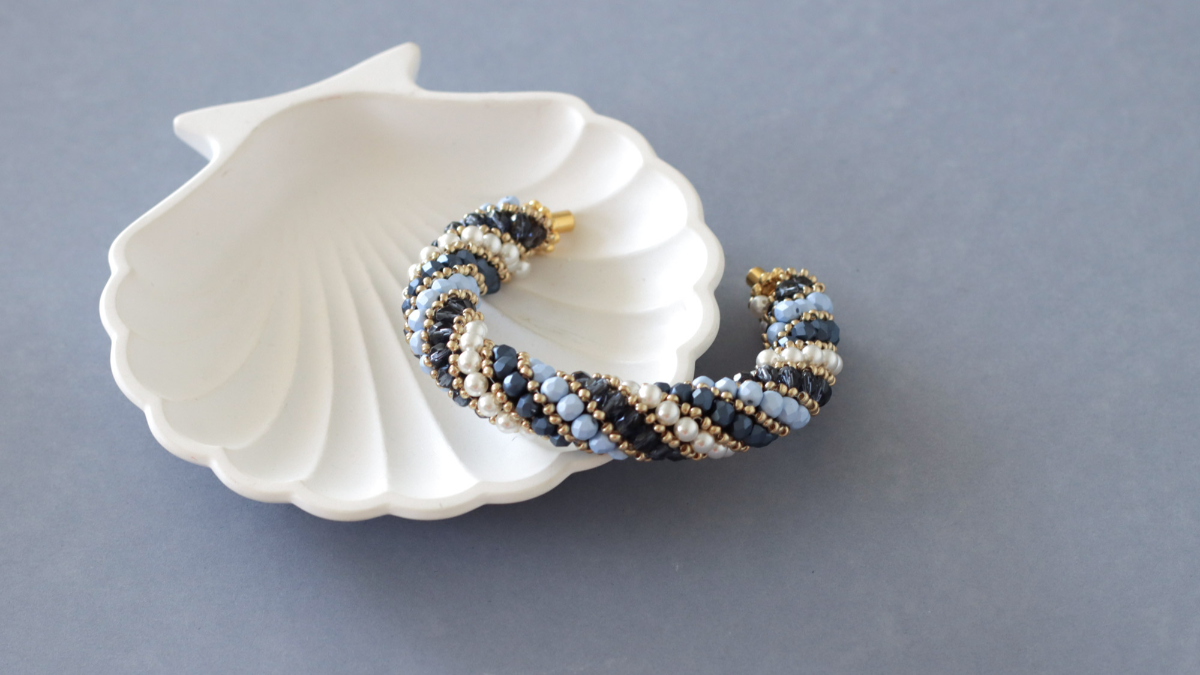La técnica de la espiral rusa es una técnica de tejido con aguja para hacer tubos de cuentas con efecto espiral. No es necesario saber hacer ganchillo. Es una técnica bastante sencilla y accesible. Puedes utilizar cualquier tipo de abalorios con esta técnica, pero dependiendo de la combinación de abalorios que elijas, el resultado será más o menos suelto. Se puede ver un poco del hilo entre las cuentas, así que elige un color de hilo adecuado. Si tu creación es muy oscura, utiliza hilo negro. En cualquier caso, debes tener un tubo de goma para introducirlo en el tubo de cuentas para que mantenga su forma tubular. Si no pones nada dentro, el tubo de abalorios se aplanará.