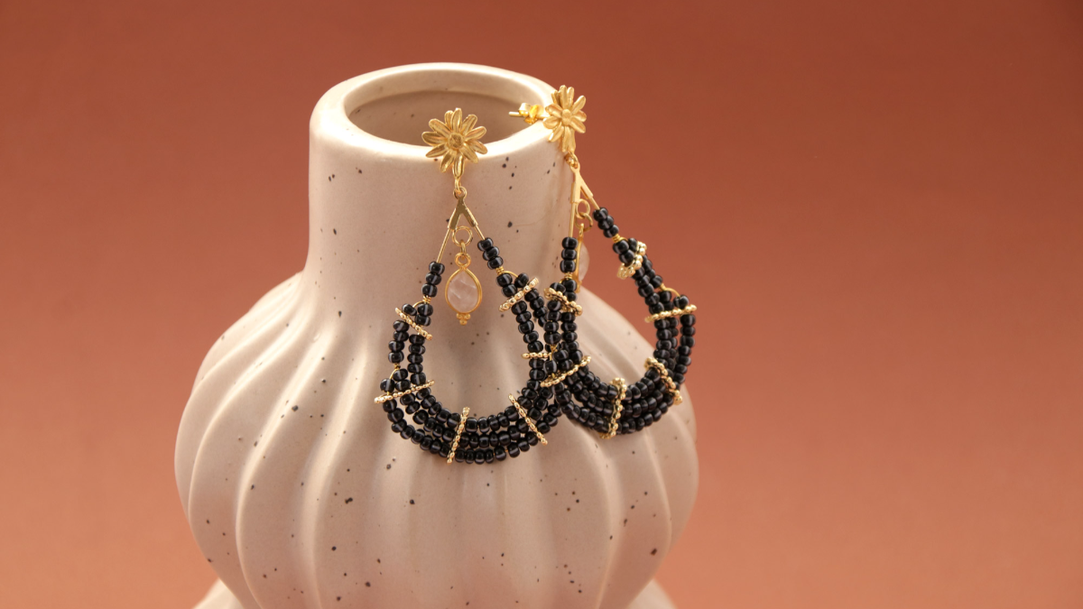 Hoy presentamos un tutorial en vídeo para hacer pendientes negros de abalorios de rocalla. Estos pendientes gota negros están hechos con cuentas de semillas Preciosa del tamaño 8/0. Se trata de cuentas negras con rayas blancas, inspiradas en las cuentas de semillas tradicionales africanas. El uso de este tipo de abalorios aporta un toque de originalidad y acentúa el aspecto artesanal de esta creación.