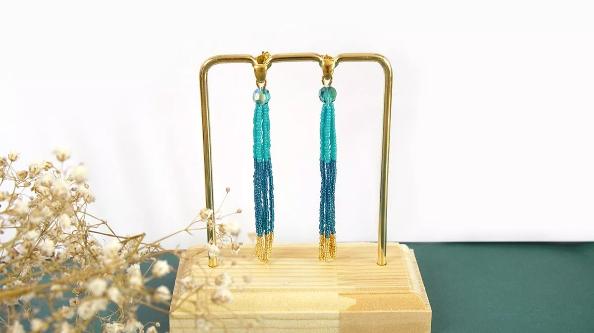 Corta 1 m de hilo de coser. Enhebra el hilo en una aguja. Enhebra una cuenta de semillas dorada y fíjala a 20 cm del extremo del hilo como cuenta de apoyo. Para ello, pasa dos veces la aguja por el agujero de la perla. Se utiliza una perla de retención para evitar que las perlas se deslicen al enhebrarlas.