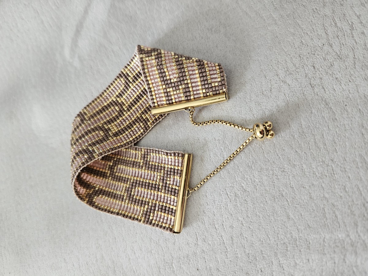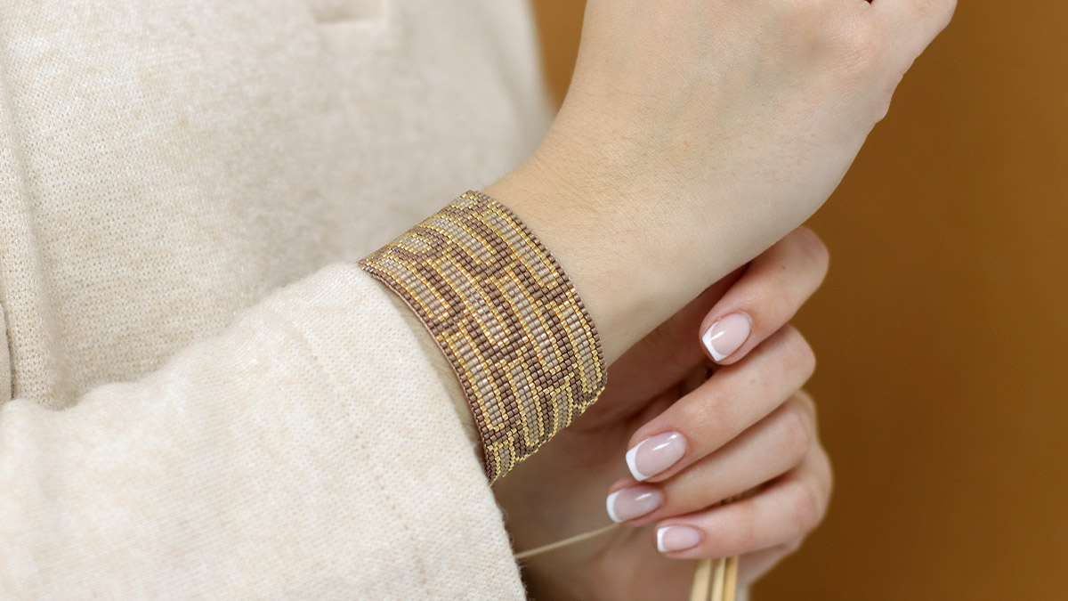 La pulsera tiene 24 cuentas de ancho, por lo que se necesitan 25 hilos. Fije los 25 hilos al telar: 23 hilos en hilo para enfilar Miyuki y 2 hilos en cordón de peso fino C-LON. No corte los hilos hasta que estén todos unidos. Simplemente enrolle el hilo, todavía conectado a la bobina, alrededor del pasador del telar.