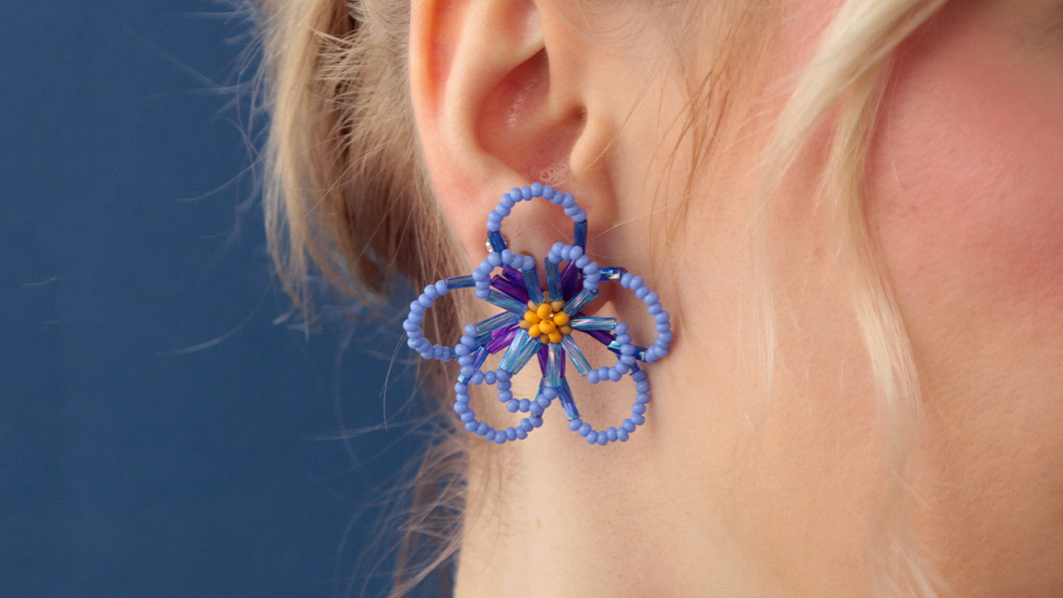 Aprenda a hacer pendientes de flores con cuentas de rocalla y cuentas tubulares. He utilizado cuentas de semillas Preciosa 11/0 y cuentas tubulares Miyuki. La flor está hecha con hilo de nailon de 0,20 mm, porque se necesita un hilo un poco más rígido que el de tejer para mantener los pétalos de la flor en el aire. La técnica consiste en crear el corazón de la flor en peyote circular y cerrar la bola de cuenta creada en un pendiente de tachuela. A continuación, se pasa el hilo a través de las perlas del corazón para añadir los pétalos.