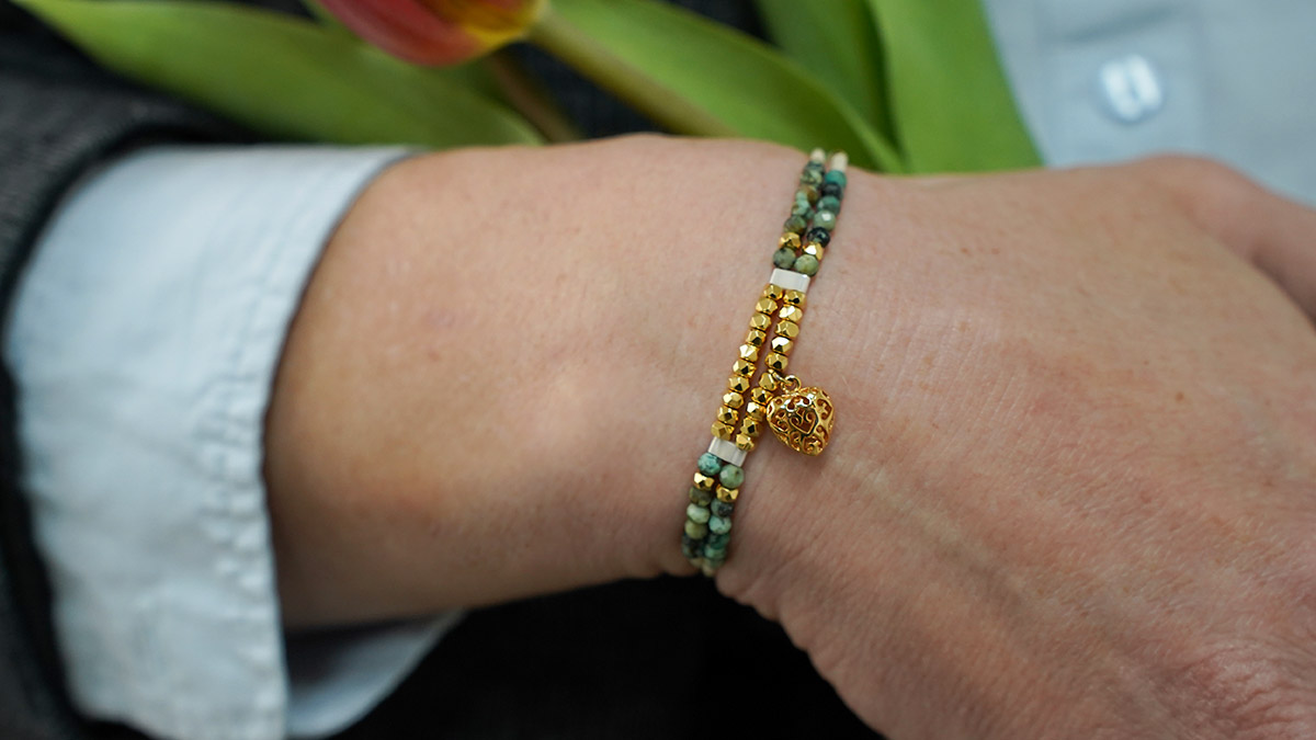 Enhebre una cuenta Miyuki Delica dorada, 5 cuentas de color crema, 1 cuenta de color Miel, 1 cuenta de color Miyuki dorada, 1 cuenta de color Miel, 5 cuentas de color crema, 1 cuenta de color Miyuki dorada, 1 cuenta de color Turquesa africana, una cuenta Miyuki Delica dorada, 5 cuentas de color crema, 1 cuenta de color Miel, 1 cuenta de color Miyuki dorada, 5 cuentas de color Turquesa africana, 1 microesfera dorada, 1 cuenta de color Turquesa dorada y 1 cuenta Miyuki Delica dorada.Me bead, 1 cuenta Miel, 1 cuenta Miyuki dorada, 1 cuenta Miel, 5 cuentas Crema, 1 cuenta Miyuki dorada, 5 cuentas Turquesa africana, 1 microespaciador dorado, 1 cuenta Turquesa africana, 1 cuenta Media Tila, 10 microespaciadores dorados. Repita el enhebrado en orden inverso. Ajuste el número de cuentas Delica al tamaño de su muñeca. Haga un nudo temporal en el otro extremo.