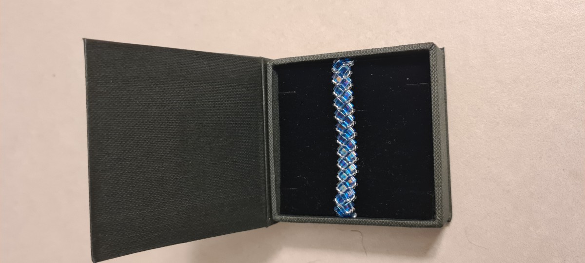 Si decides tejer la pulsera con hilo Fireline, puedes utilizar una aguja Tulip de tamaño 10. No necesitas hacer un nudo para cerrar la pulsera. Basta con pasar el hilo en zigzag a través de una decena de cuentas.