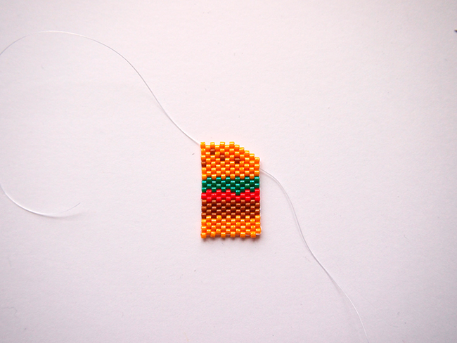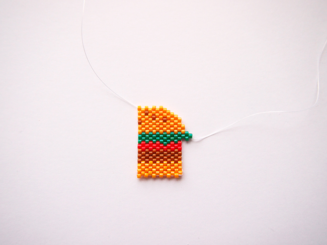 Teje las dos últimas filas (filete y pan). Introduce el hilo en algunas cuentas y corta el hilo sobrante.