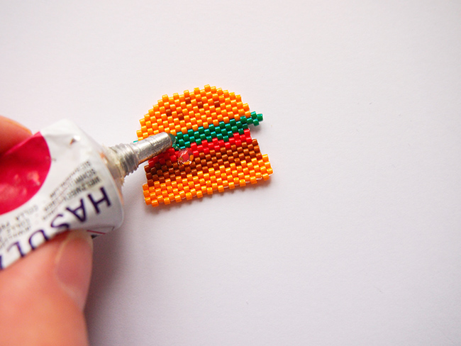 Para dar rigidez al broche, unta la parte posterior con cola para bisutería y fija el soporte del broche. Deja secar según las instrucciones del pegamento.
