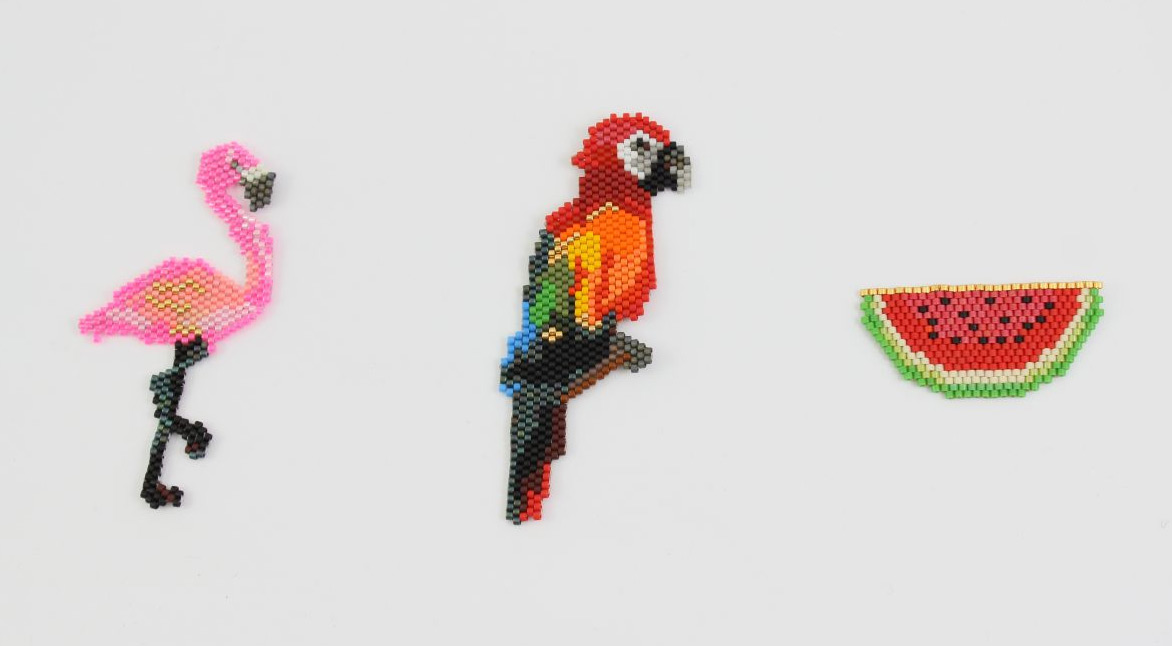 Aquí tienes las tablas para tejer un loro de cuentas y un flamenco rosa.