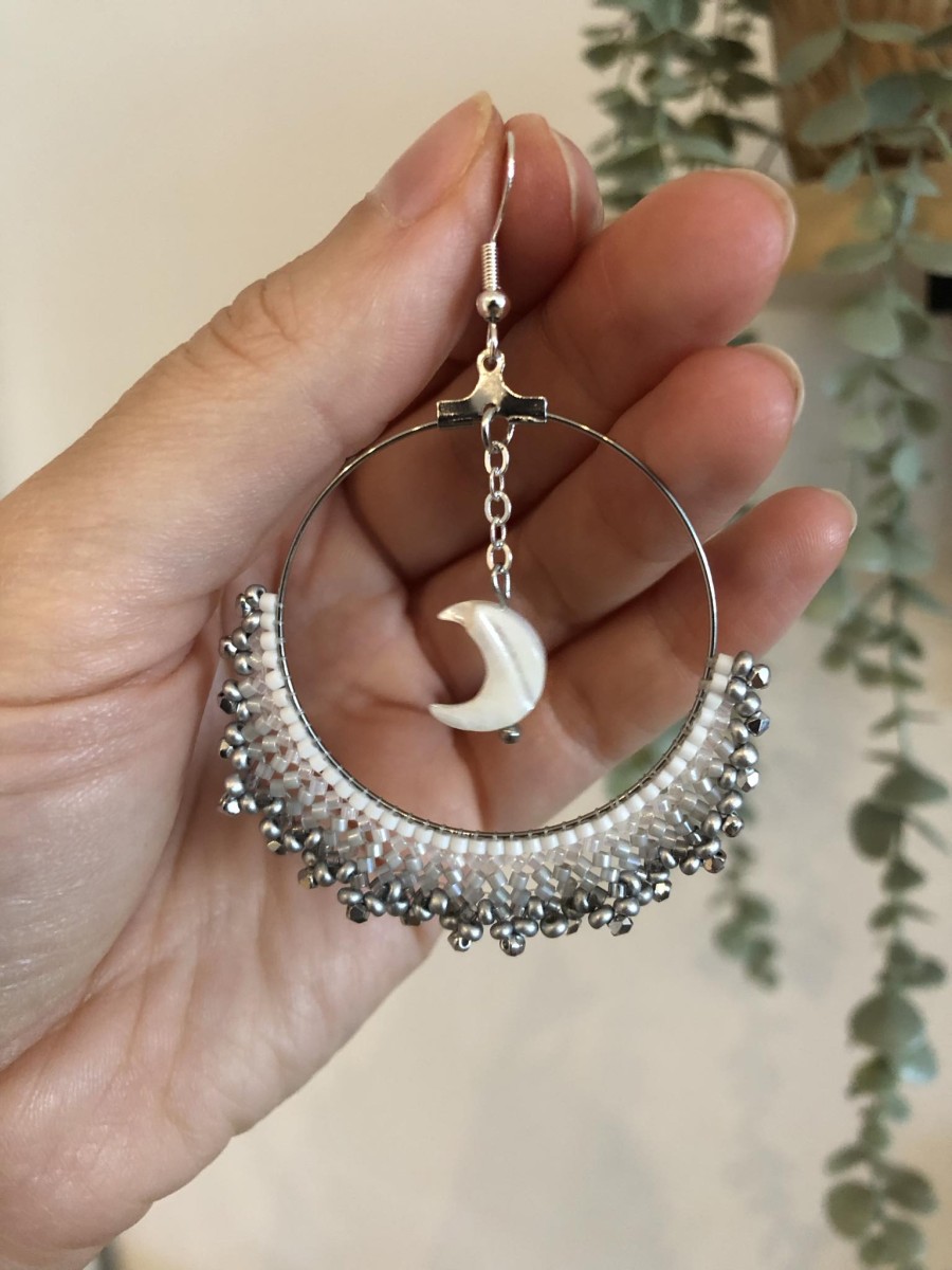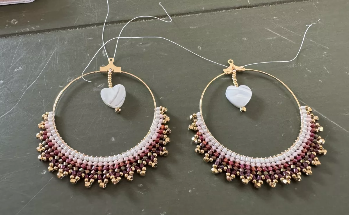 Enderece el extremo del hilo en la parte posterior del criollo con unos alicates planos para evitar que el criollo se abra durante el tejido. Corte aproximadamente 1,5 m de hilo fireline de 0,10 mm y enhebrelo en una aguja del tamaño 12. Haga un nudo doble en la criolla en el punto en el que desea empezar a tejer. Conserva 20 cm del extremo del hilo. Para hacer la primera hilera de punto ladrillo, enhebre dos cuentas DB-0352 y pase la aguja por debajo del criollo para sacarlo por el centro. A continuación, vuelve a pasar la aguja por la segunda cuenta que has enhebrado. Aprieta bien para colocar las cuentas perpendiculares al criollo. Vuelve a pasar la aguja por la primera cuenta, luego por la segunda y aprieta para enderezar las dos cuentas.